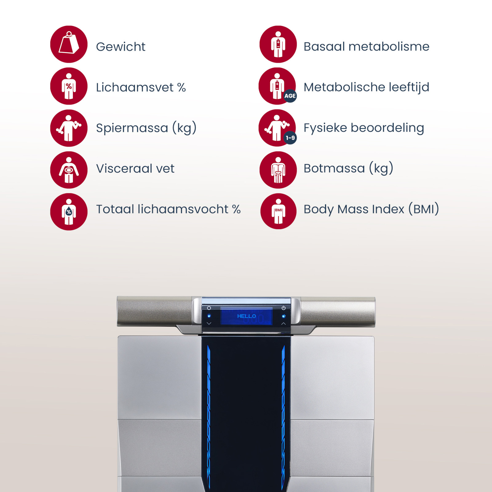 - Metrieken: gewicht, lichaamsvet, totaal lichaamsvocht, spiermassa, lichaamsbouw, botmineraalmassa, basaal metabolisme, metabolische leeftijd, body mass index, visceraal vet, 5 segmentale vetstatistieken en 5 segmentale spierstatistieken