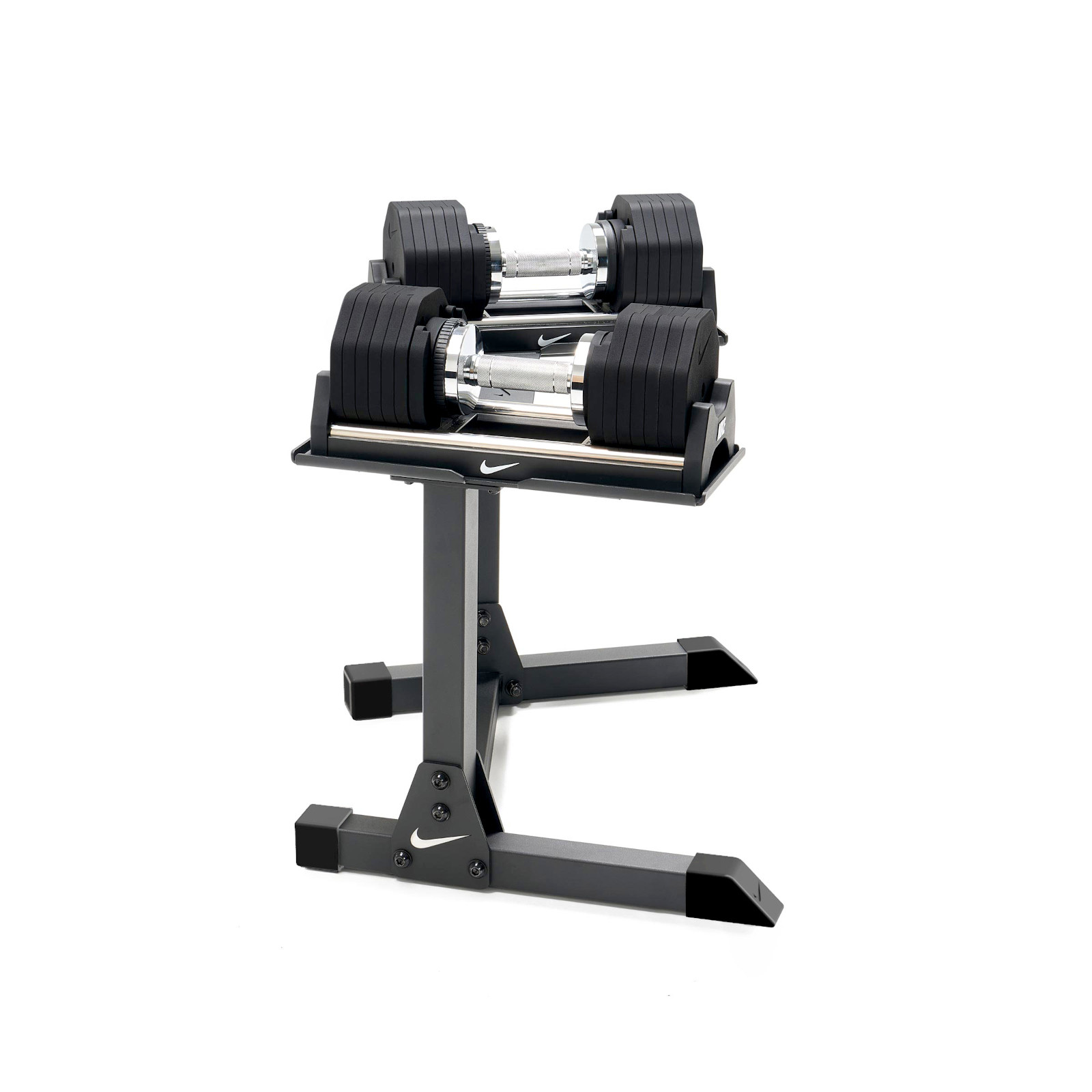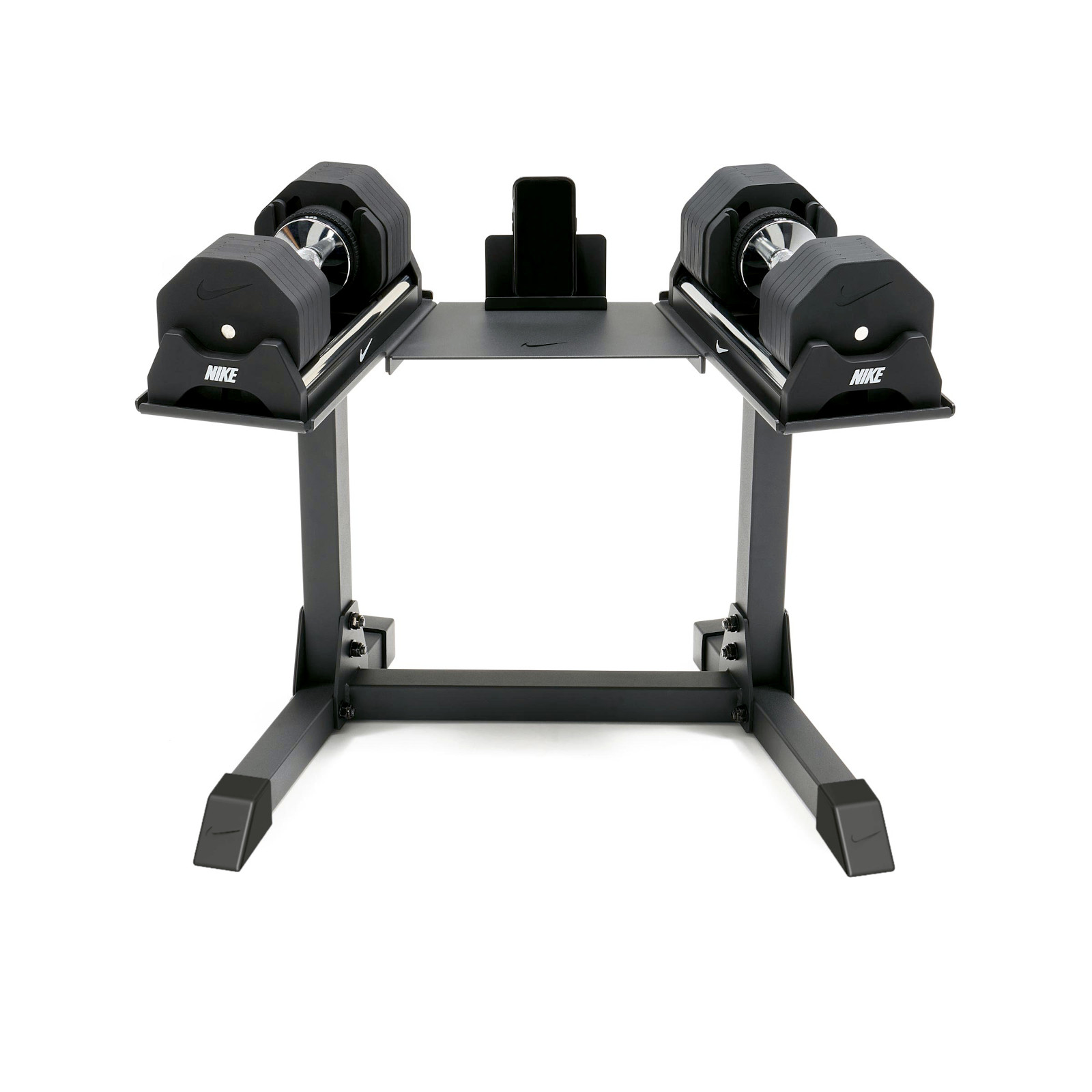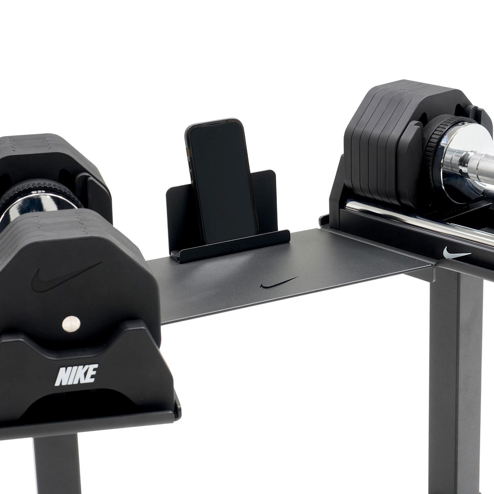 Le Rack Nike pour haltères réglables est le complément idéal pour optimiser votre entraînement avec haltères réglables Nike. Conçu en acier robuste avec revêtement poudré, ce support garantit une excellente stabilité et un rangement sécurisé de vos haltères. Il facilite également leur prise en main et leur remise en place après chaque série, pour un entraînement de musculation fluide et organisé à domicile.Grâce à ses pieds en caoutchouc, le support protège efficacement votre sol tout en assurant une parfaite stabilité. Son design soigné apporte une touche haut de gamme à votre espace fitness. Pratique, il intègre également un support pour tablette et smartphone, idéal pour suivre vos programmes d’entraînement, applications fitness ou vidéos pendant vos séances.